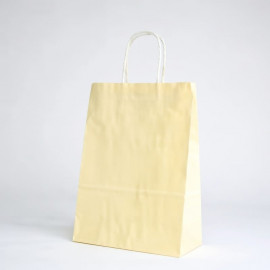 Safari paper bag with a wide bottom, 90gr/m² paper in colored white kraft or natural kraft, your choice. The paper handles are twisted, offering ecologically responsible and customizable paper bag models.